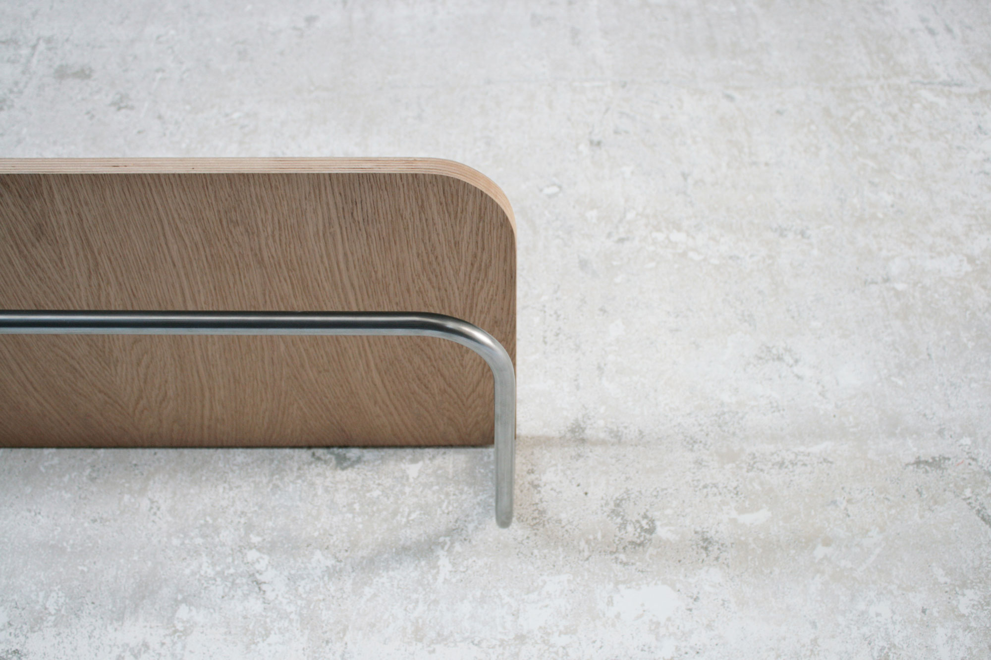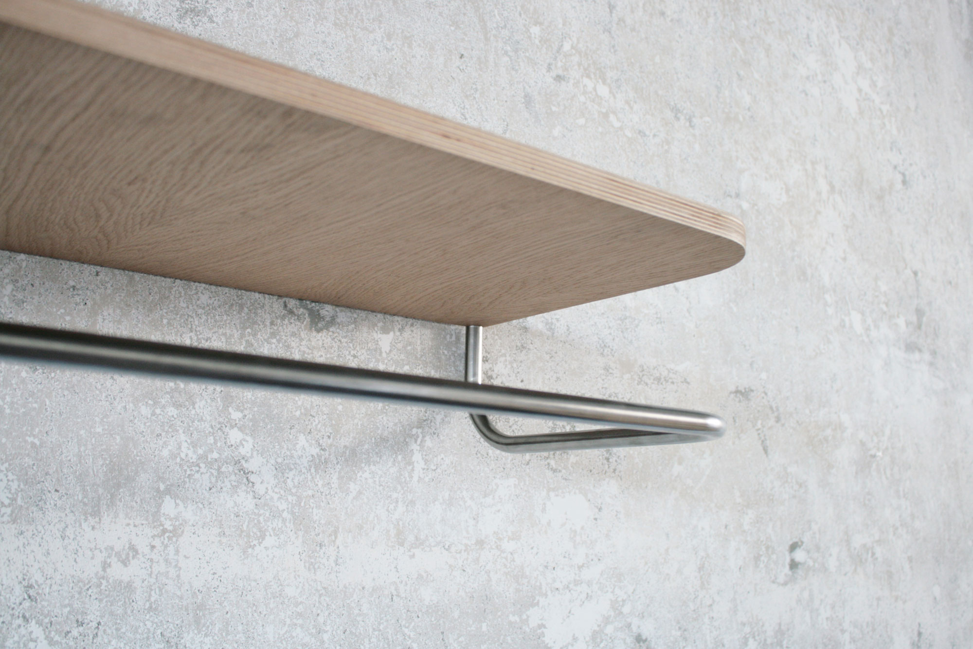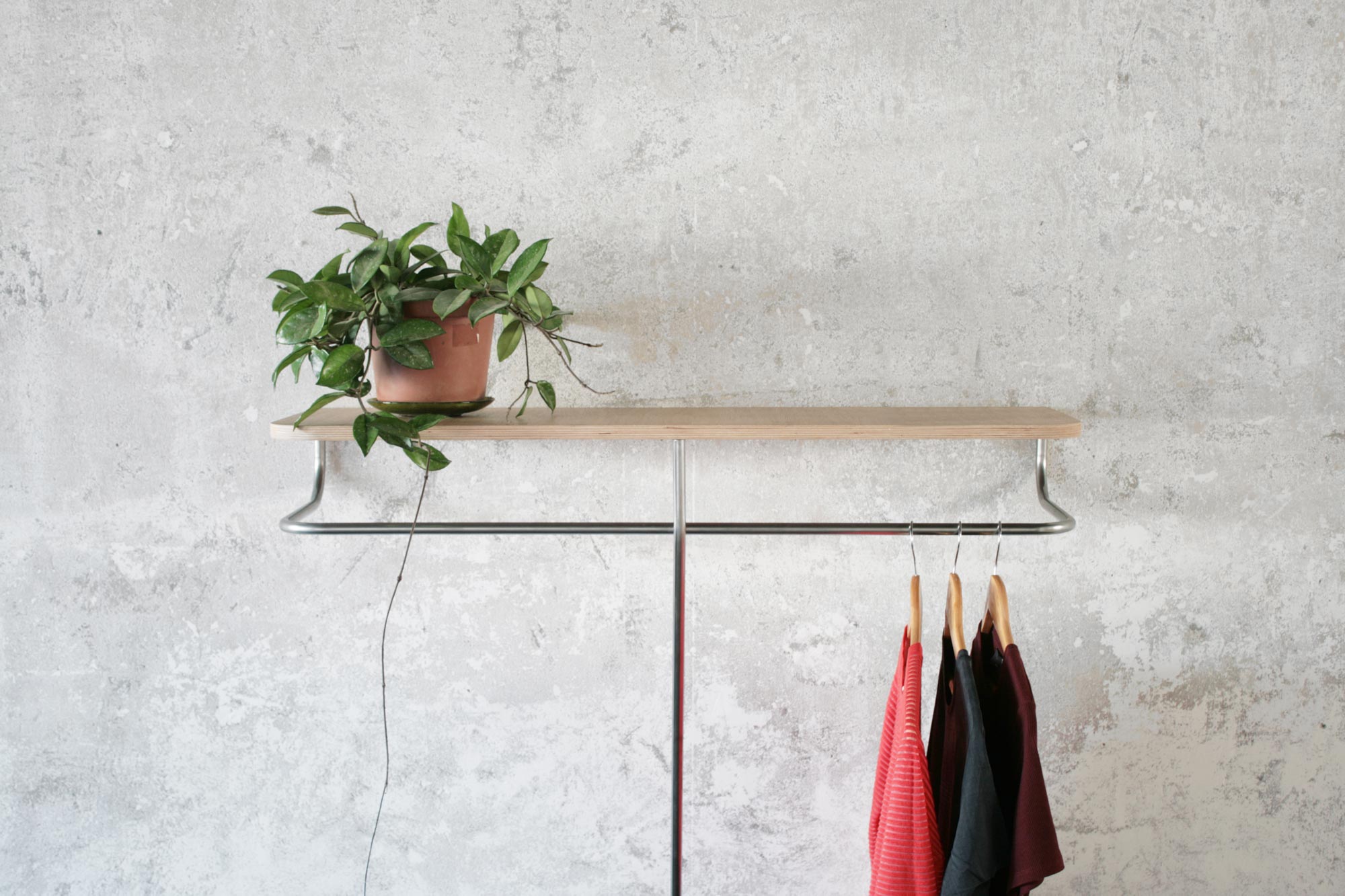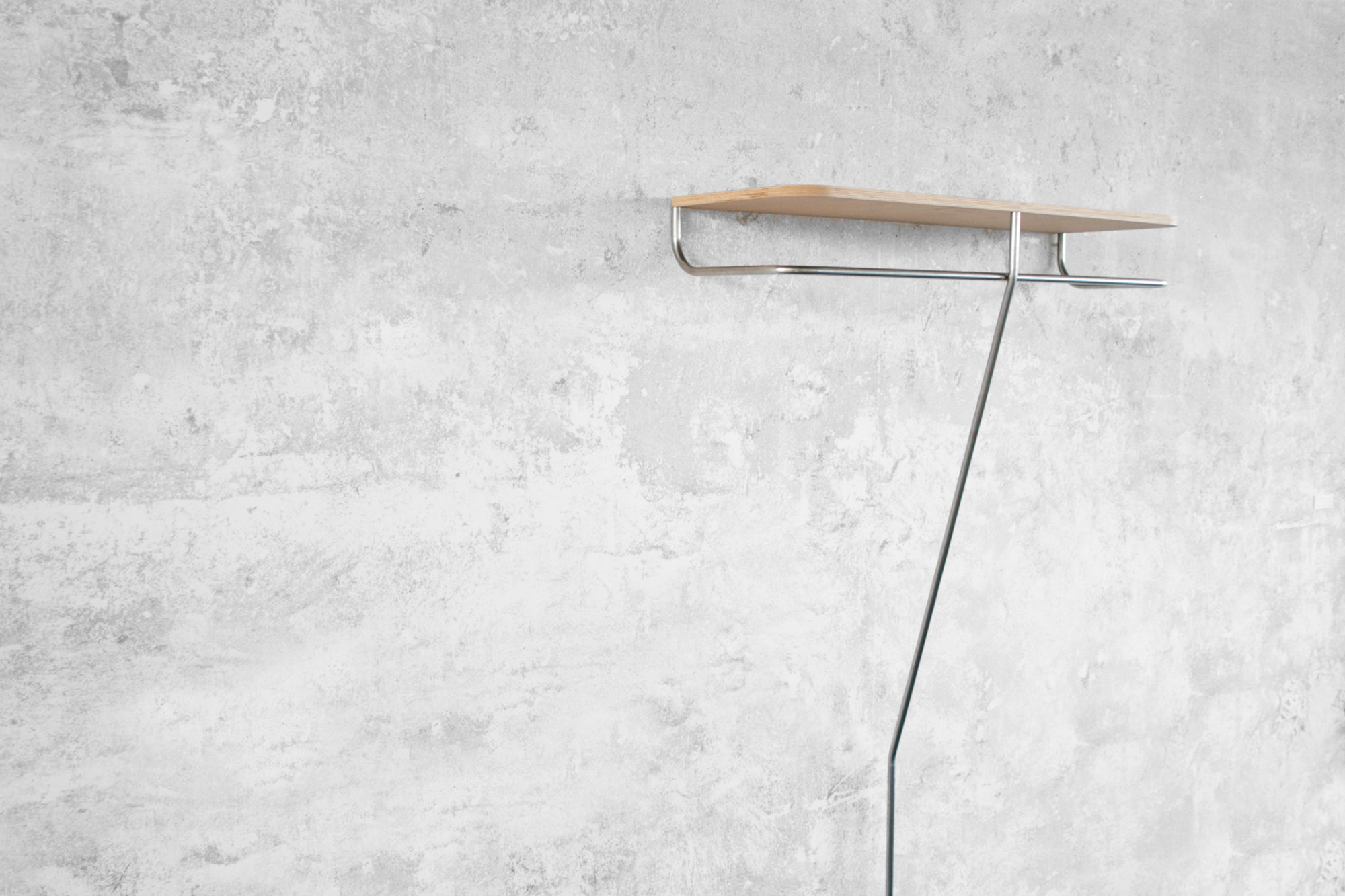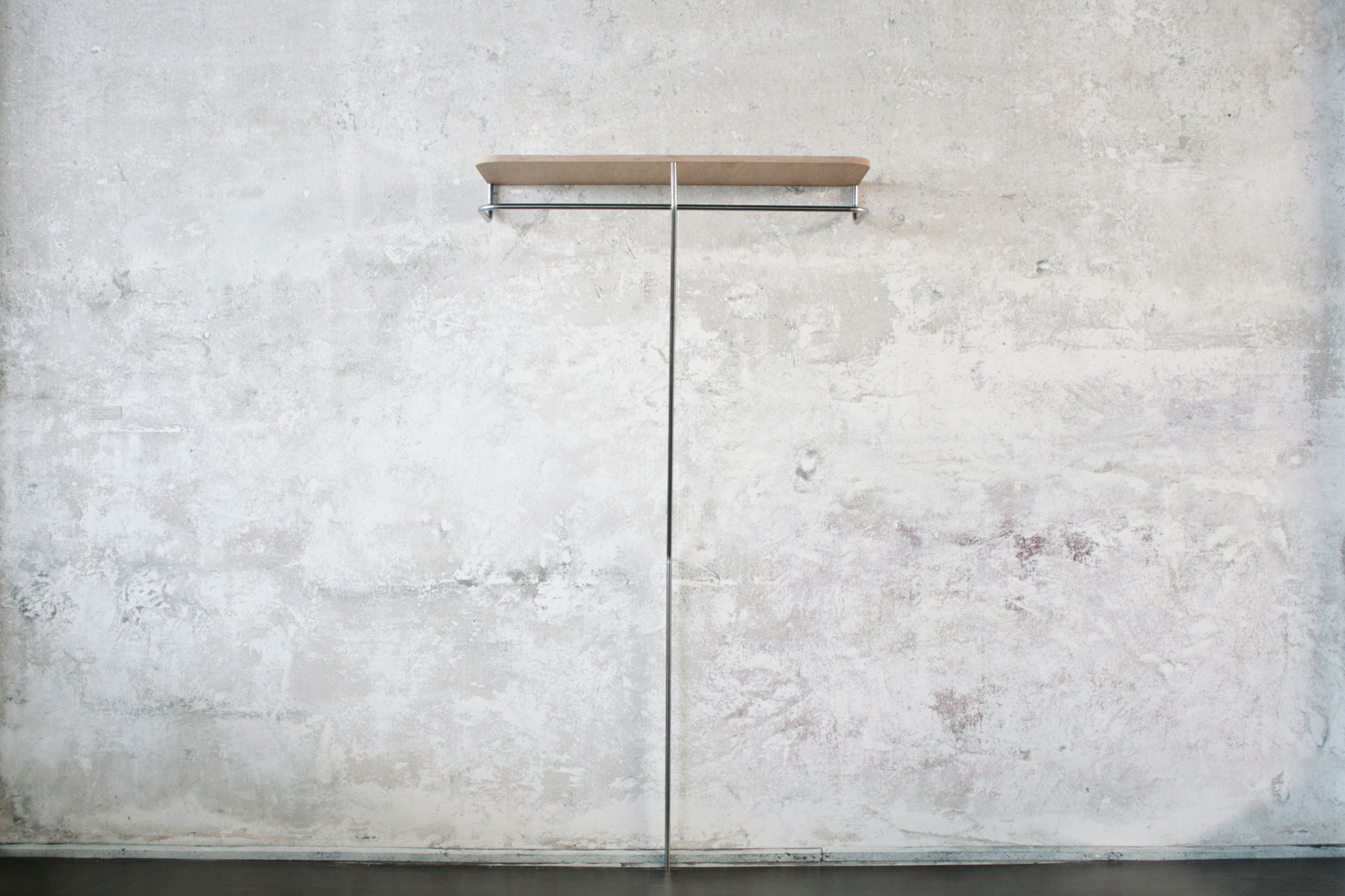 X Gaia es un perchero coronado por un estante. Se basa en dos lí­neas de acero que se tocan entre y sostienen la lámina de madera.Está fijada en dos puntos a la pared y simplemente se apoya en el suelo con una pata vertical, que se retranquea con una curva delicada y libera espacio a sus pies.La pieza superior en madera de roble varí­a su dimensión horizontal según la pared que se desee ocupar. Se remata con curvas en sus esquinas y permite la firmeza de todo el conjunto sirviendo de unión entre las dos piezas de acero estructural.