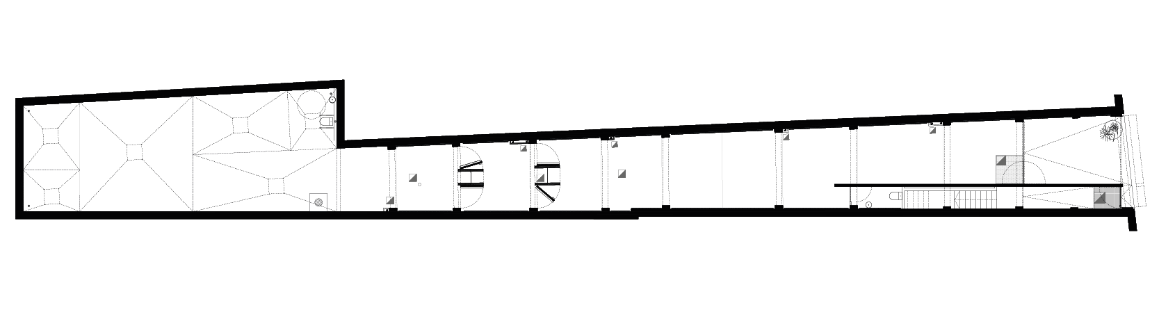 Una línea a dos metros de altura recorre todo el local, llegando a la parte trasera, donde nos encontramos un espacio cubierto con pirámides truncadas de tela, que dirigen la luz natural cenital acotando virtualmente este espacio principal.
